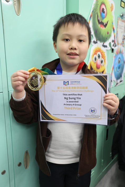 4C吳崇彥 榮獲 第十五屆香港數學挑戰賽 小學四年級組 三等獎