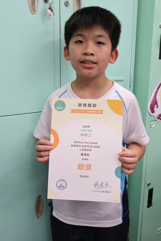 4C林學之 榮獲 第十五屆香港數學挑戰賽 小學四年級組 優異獎 、 Fun Fun Arena 香港學科比賽2025-2026上學期初賽 數學科 銀獎