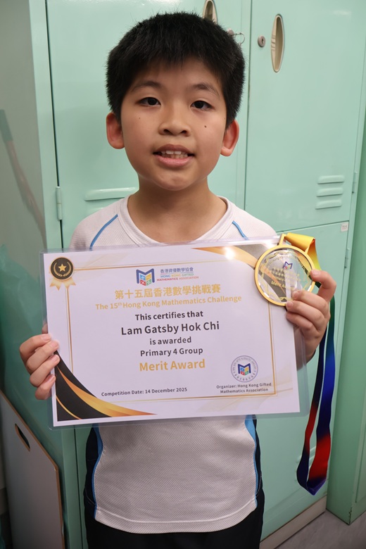 4C林學之 榮獲 第十五屆香港數學挑戰賽 小學四年級組 優異獎 、 Fun Fun Arena 香港學科比賽2025-2026上學期初賽 數學科 銀獎